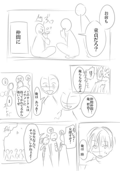 - あらすじ:童貞で大学に入学した陸は、哲也とあつきという2人の童貞仲間と出会う。3人は合コンや海辺でナンパして、どうにかして彼女を作ろうとしたができない。。果たして3人は童貞を卒業できるのか?